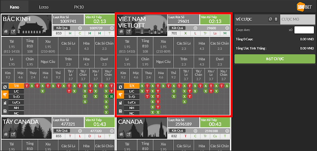 Từ nay, bạn có thể tham Khám phá ngay sổ số KENO - VIETLOTT tại 188BET, cùng với các sàn xổ số lâu đời khác như Bắc Kinh, Canada, Tây Canada, Slovakia, Úc.