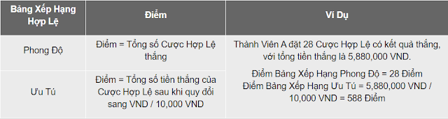 - Đạt tối thiểu 18 cược đơn thắng tại bất kỳ trận đấu NBA trong Thời Gian Khuyến Mãi;- Thành Viên Hợp Lệ sẽ được tham gia vào Bảng Xếp Hạng Phong Độ và Bảng Xếp Hạng Ưu Tú và nhận được điểm , như bảng bên dưới: