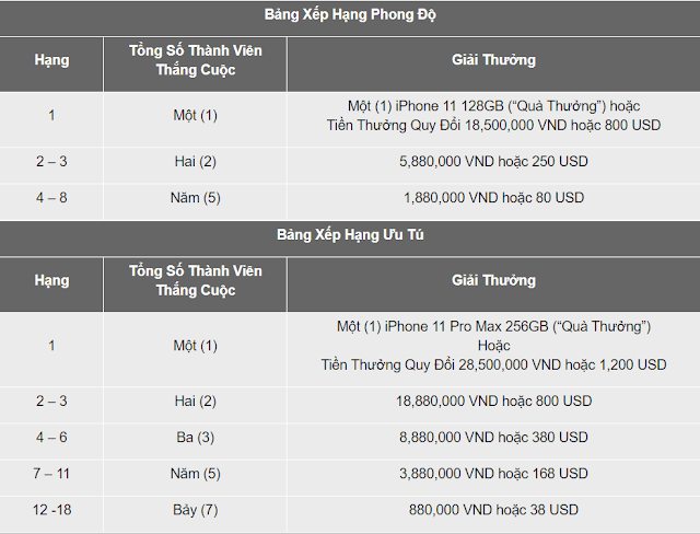 - Tổng 18 Thành Viên Hợp Lệ có số Điểm cao nhất tại Bảng Xếp Hạng Phong Độ và tổng tám (8) Thành Viên Hợp Lệ có số Điểm cao nhất tại Bảng Xếp Hạng Ưu Tú sẽ được lựa chọn để trở thành thành viên thắng cuộc nhận được giải thưởng, như bảng dưới: