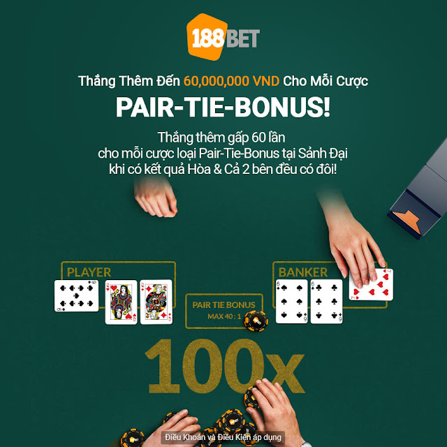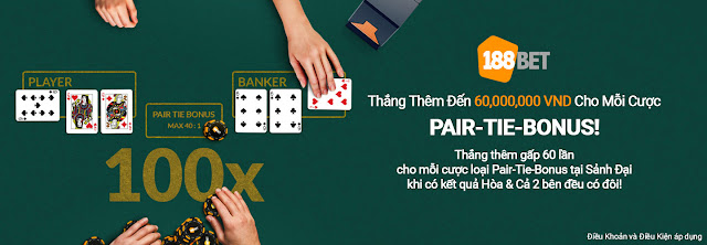 - Chỉ những cược Pair-Tie-Bonus thắng đặt tại Trò Chơi Hợp Lệ trong Tuần Khuyến Mãi của Thời Gian Khuyến Mãi khi kết quả là Hòa & Cả 2 bên đều có Đôi là hợp lệ. Cược hủy, các loại cược khác và cược loại Pair-Tie-Bonus với sự kết hợp khác sẽ không hợp lệ.