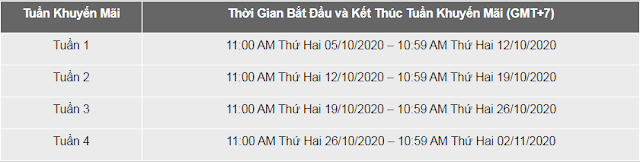 - Từ ngày 05/10/2020 11:00 AM (GMT+7) đến ngày 02/11/2020 10:59 AM (GMT+7);