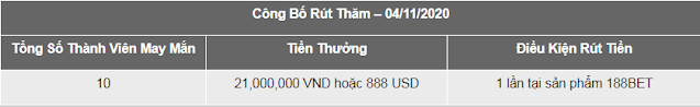 - Thành Viên Hợp Lệ đặt tối thiểu 40 Cược Hợp Lệ trong Thời Gian Khuyến Mãi sẽ nhận được một (1) vé tham gia vào rút thăm sau khi Khuyến Mãi kết thúc và có cơ hội thắng tiền thưởng, như bảng dưới: