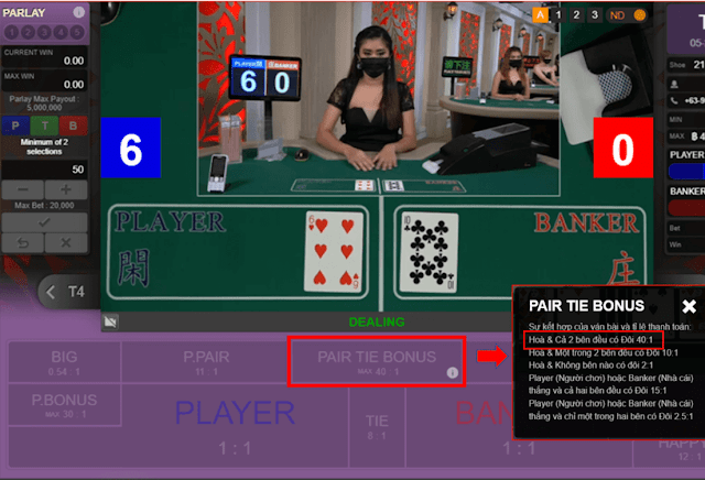 Cược ngay cho loại cược Pair-Tie-Bonus (Đôi-Hòa-Bonus) tại Sảnh Đại Casino Trực Tuyến để nhận thêm đến 60,000,000 VND hoặc 2,500 USD cho mỗi cược thắng khi kết quả là Hòa & Cả 2 bên đều có đôi.