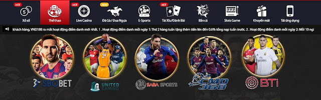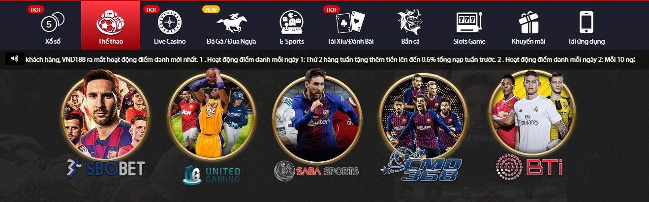 Web cá cược bóng đá Vnd188 tự hào là 1 trong số ít các nhà cái có tới tận 5 nền tảng cá độ bóng đá uy tín và có tiếng bậc nhất trong giới cá độ như: SBO, BTi, Saba, CMD368, UG Sport.
