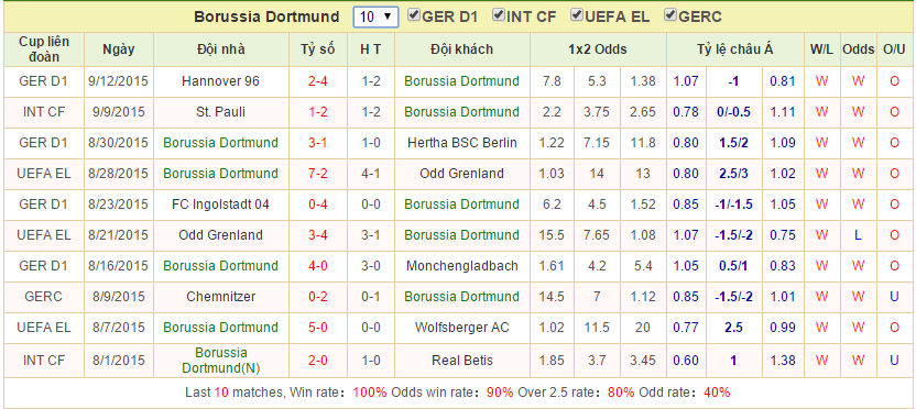 5 trận gần nhất của Dormund tại Europa League có ít nhất 2.5 bàn